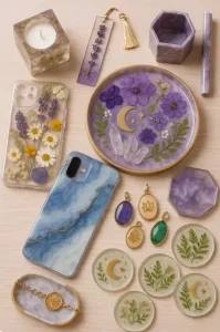 🌿 Sección 1 – Resina: Técnica, proyectos y maestría: Desde los fundamentos, la mezcla perfecta, colores y efectos, hasta proyectos guiados y acabados profesionales. Vas a aprender a crear fundas, amuletos, encapsulados y piezas de alto valor que transmitan intención y energía.