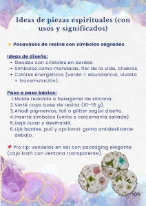 El ebook tiene más de 280 páginas llenas de contenido dividido en 3 grandes secciones: técnica de resina, emprendimiento con propósito y rituales espirituales. Incluye proyectos guiados como fundas, amuletos, posavasos, placas y mucho más, además de extras prácticos como tablas, plantillas y checklists.